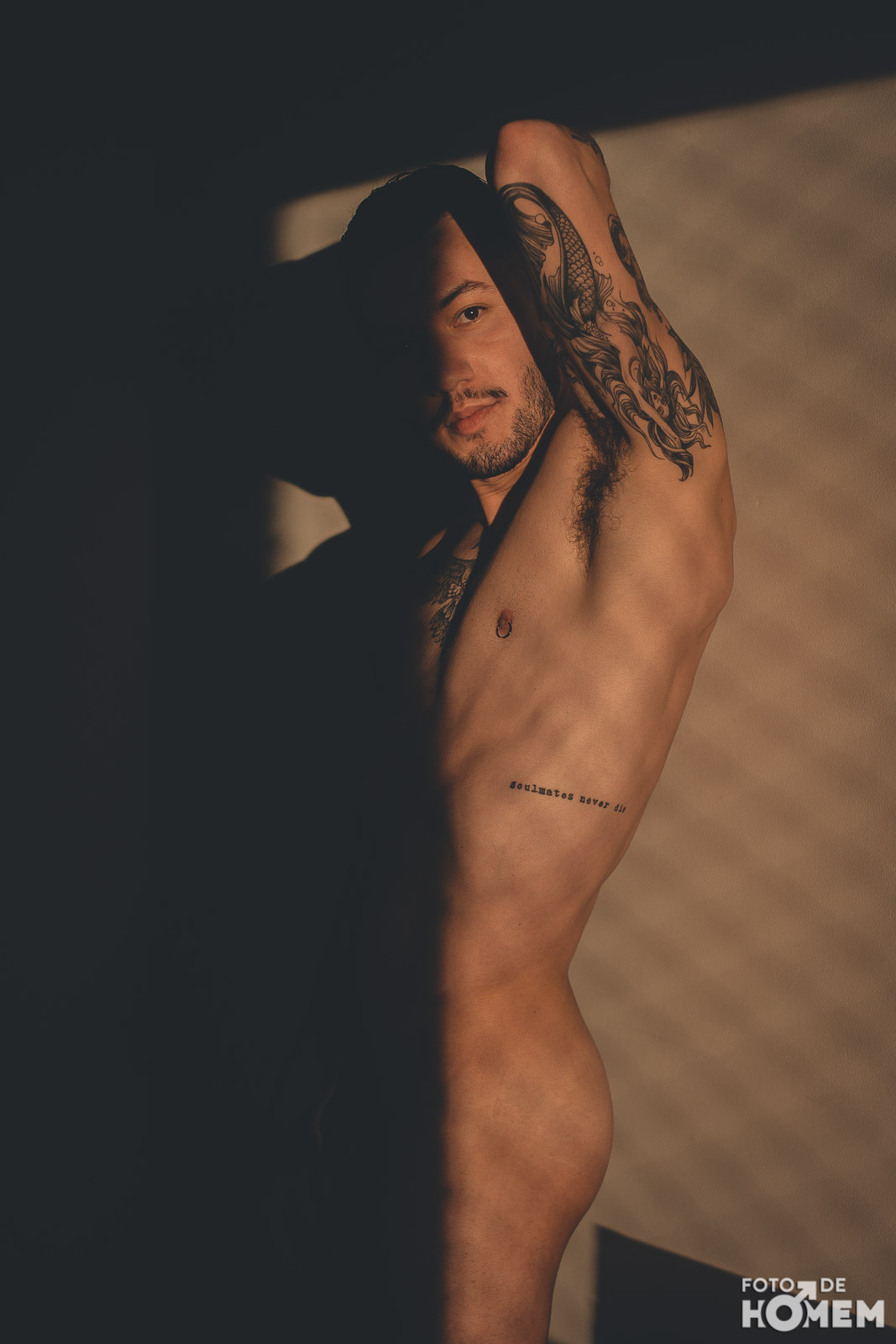 Rafael tem 23 anos e mostrou-se bastante tranquilo com a nudez. As fotos foram feitas numa manhã de sábado, bem cedinho. Tivemos a sorte de pegarmos um céu sem nuvens, o que poderia ser irrelevante já que a sessão foi toda feita dentro do meu apartamento. Ocorre que o Sol da manhã chegou forte e criou um excelente contraste de luz e sombra, que foi a tônica do ensaio.